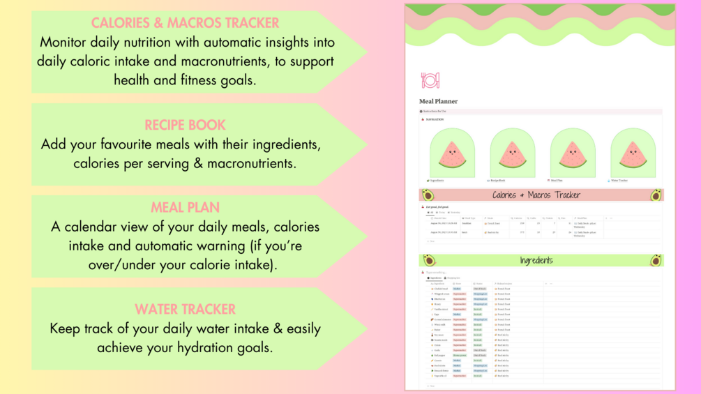 You'll get a Meal planner which includes a Calories & Macros tracker and a Water tracker.