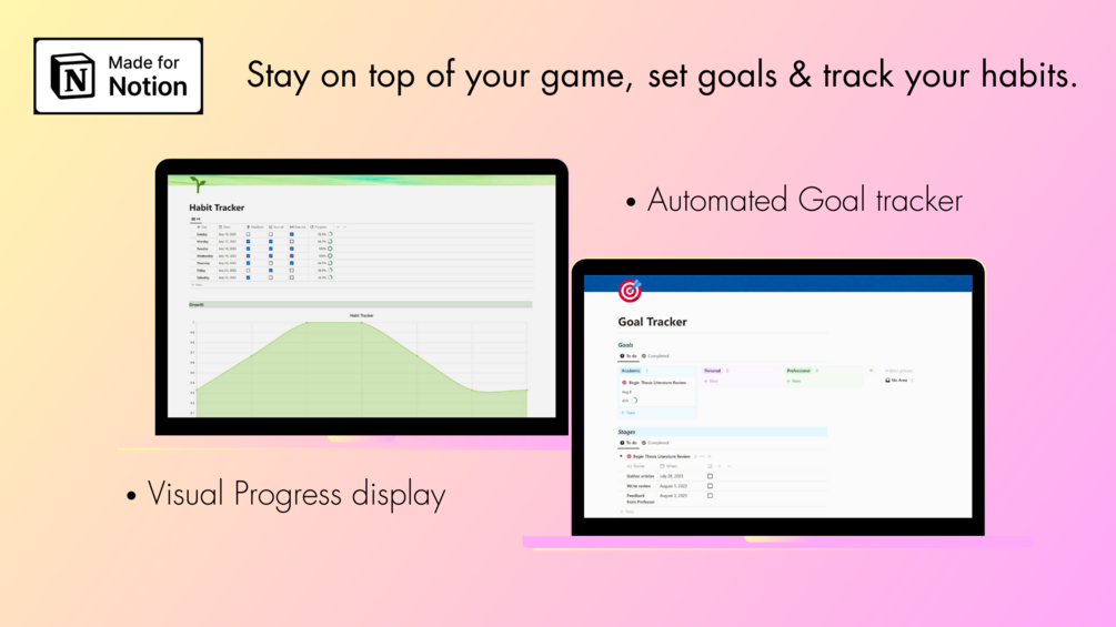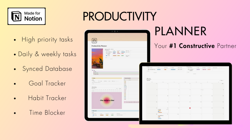 You'll get an all-in-one Productivity planner which includes synced databases, high priority tasks, today's tasks, this week's tasks, monthly overview of tasks, goal tracker, habit tracker and time blocker.
