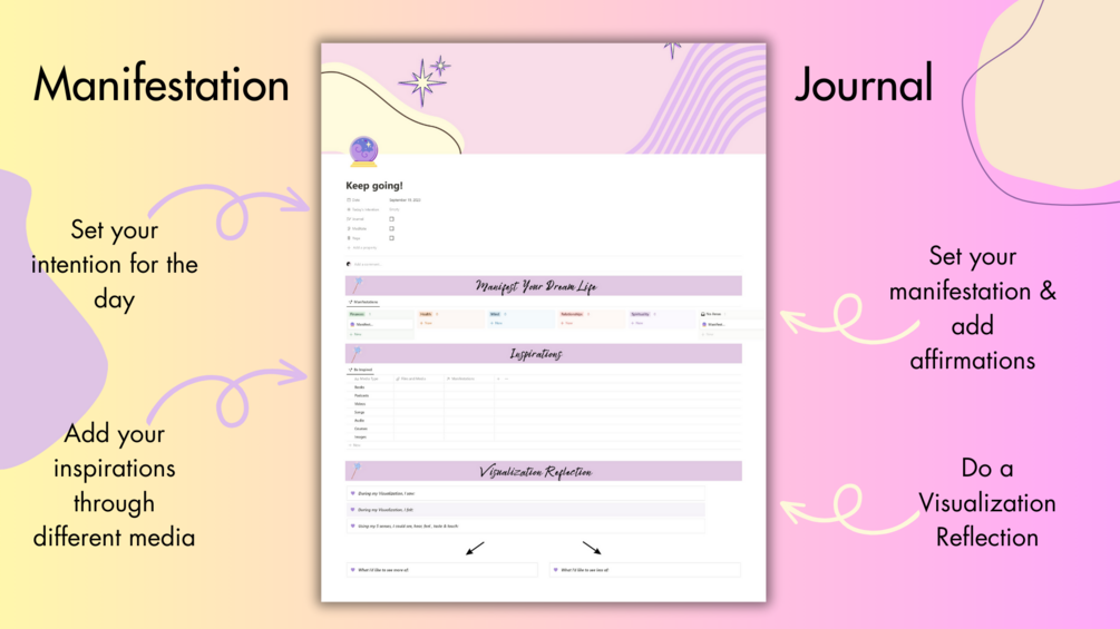 But, THERE'S MORE! You'll receive the creative canvas of a vision board to visualize your dreams vividly and a manifestation journal to manifest your dream life, keep track of your manifestations & perform visualization reflections!