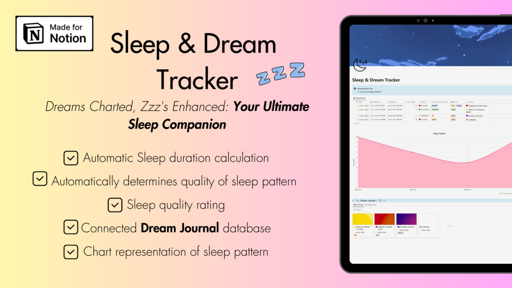 You'll get an all-in-one Sleep & Dream Tracker to monitor your sleep duration and patterns over time with a connected Dream Journal database to record your dreams.